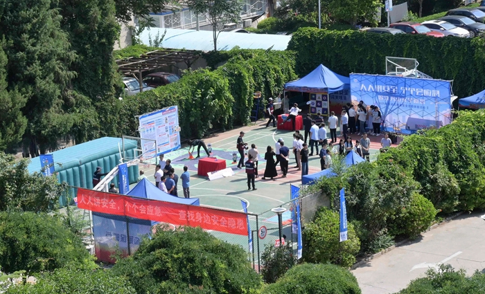 演練結(jié)束后,舉辦方在大廈籃球場開啟安全咨詢體驗活動。整個活動共設(shè)置了6個項目,分別為擁擠踩踏應(yīng)急處置體驗區(qū)(充氣帳篷)、消防隱患排查試驗區(qū)、電動車電池穿刺爆燃體驗裝置、溺水自救互救教學培訓區(qū)、醉酒交通AR模擬體驗、安全標志互動區(qū)。活動現(xiàn)場氣氛熱烈,盡管天氣炎熱,但絲毫沒有減弱大家體驗掌握應(yīng)急技能的熱情。